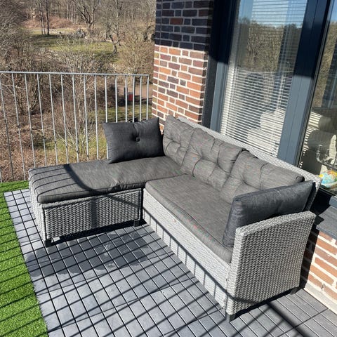 Hörngrupp utemöbler i svart konstrotting med grå kuddar. Består av modulsoffor som kan ställas som hörnsoffa samt ett lågt bord med glasskiva.