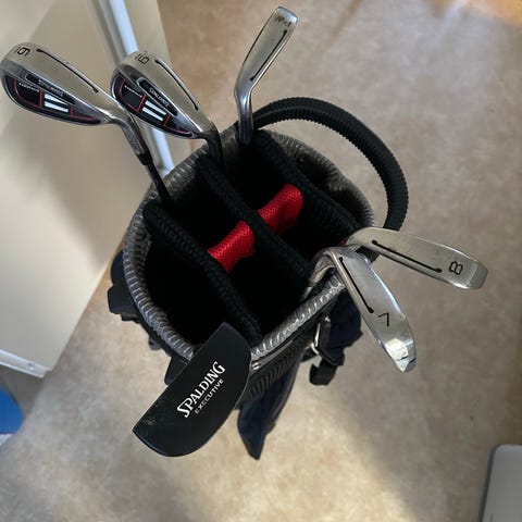Spalding golfset med bag, flera järnklubbor samt putter. Setet innehåller bland annat järnklubbor 4,6,7,8,9,pw,sw samt en putter. Och en hybrid 4 Klubborna har metallskaft och traditionella klubbhuvuden i metall. Golfbagen är en ståbag med ben men den rekommenderar jag inte att använda, har skador i bagen så den är inte så bra. Passar för allmän golfspel på bana eller träningsområde.