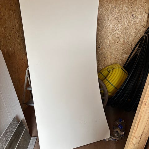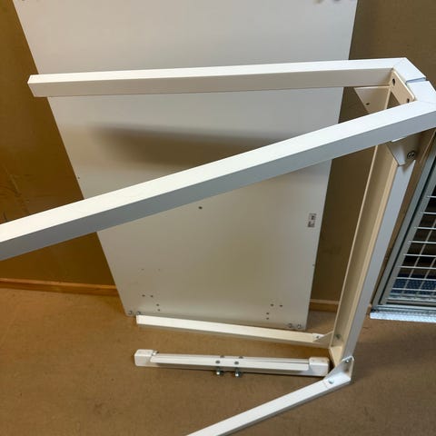 Långt fint soffbord, sprutlackerat vitt. Nu isär monterat. Bordsbenen är infällda i bordskivan. Längd 160 cm, bredd 60 cm, höjd 50 cm.
