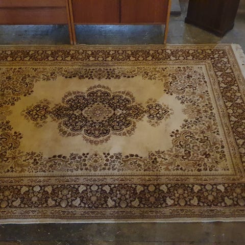 Underbar Vintage äkta matta,med blomstermotiv i ljusa färger. Tyvärr, synlig fläck efter vin. Den som känner hur man tar bort fläcken ,får mycket för pengarna. Mått 180 x 290 cm. Tjocklek 2,50