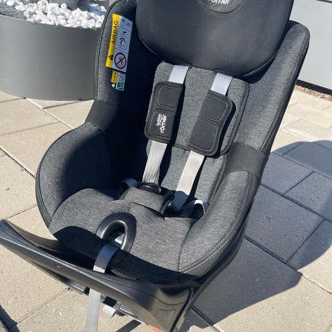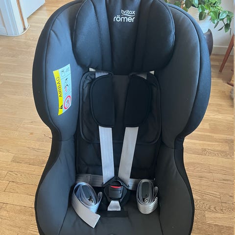 Britax Römer bilbarnstol för barn upp till 25 kg. Bakåtvänd bilbarnstol med intern fempunktssele och justerbart stödben. Klädsel i svart tyg med röda sömmar. Monteras med bilens bälte och stödben enligt anvisningarna på stolen.