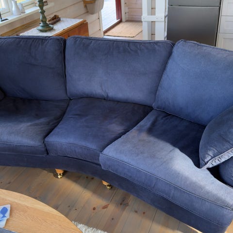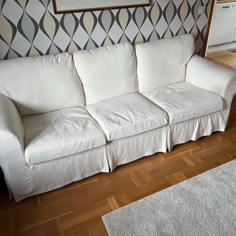 Soffan har två sittkuddar i blandning av polyeter och dun och två ryggkuddar samt två lösa prydnadskuddar i samma tyg. Klädseln är vit och avtagbar. Soffan står på mörka ekben, varav de främre har hjul i chrome.