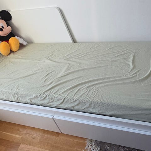 IKEA dagbädd i vit färg med tre utdragslådor under liggytan för förvaring. Sängstomme med ribbotten enligt måttskiss på bilden. Dagbädden har panelmönstrade gavlar och långsida. Vissa märken och skav på ytan förekommer, se bilder för detaljer. Passar som säng eller soffa i till exempel sovrum eller gästrum.