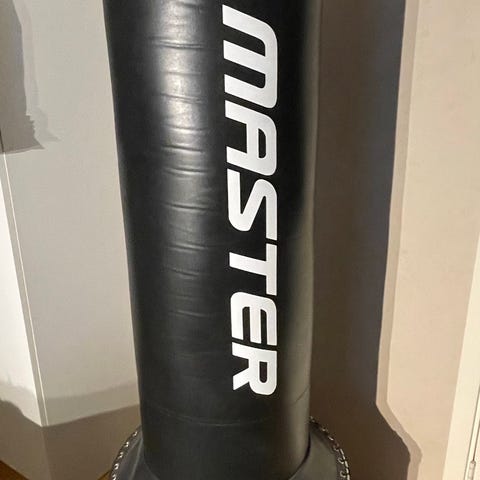 Ca 180 cm hög. Fyll botten med vikter och puckla på. Jag hade tre säckar grovbetong och några gamla kuddar i botten. Funkade fint. Stod pall för det mesta. Inkl öppna handskar storlek 9-10 i bra skick.