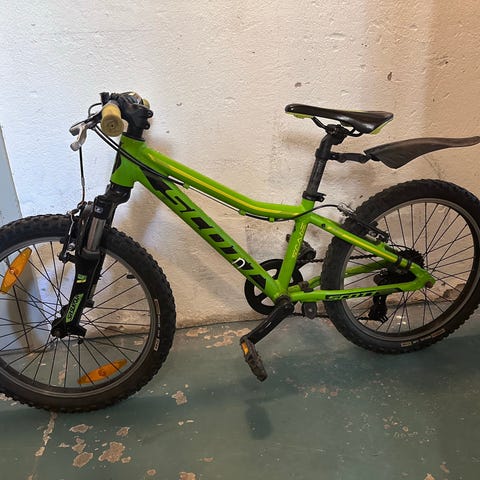 Bits barncykel med 20" hjul i vit och grön färg. Cykeln har raka styren med handbroms, stänkskärmar fram och bak, fotbroms samt pakethållare. Ena handtaget är skavt men inget som påverkar funktionen