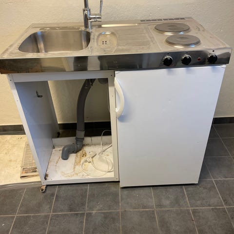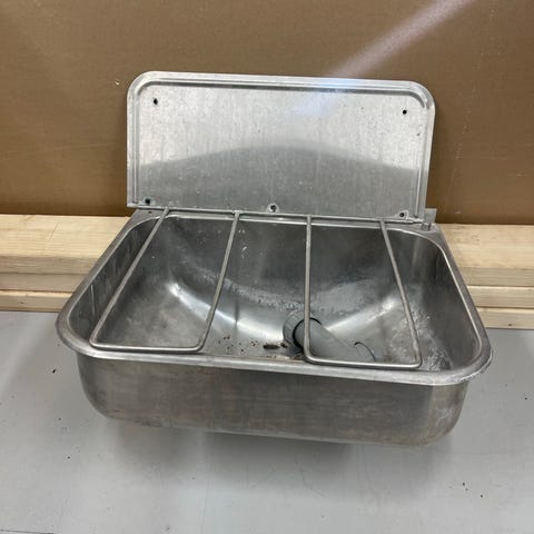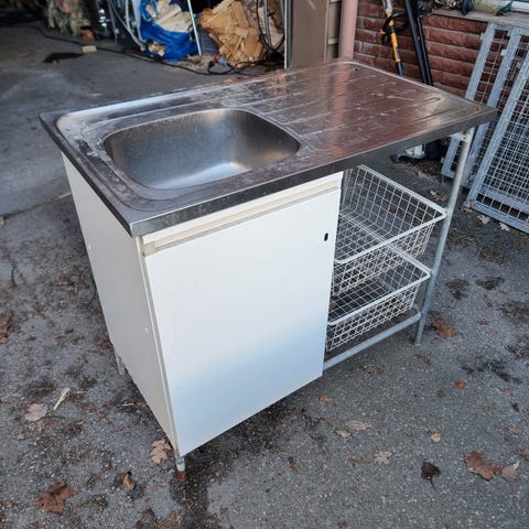 Tvättbänk med rostfri ho och vit skåpstomme. Översida och ho är i rostfritt stål med avrinningsyta och hål för blandare.