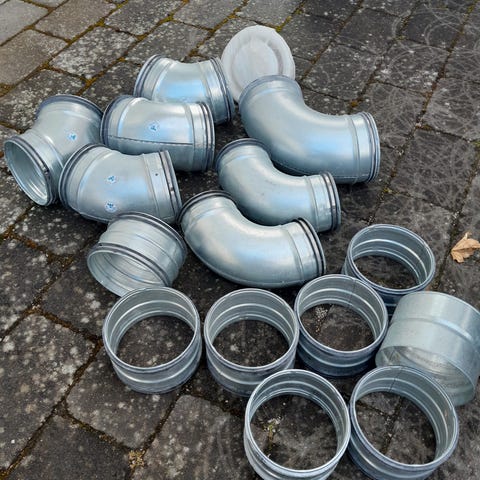 Ventilationsdetaljer med plåtrör och tillbehör. Blandat parti med spirorör, böjar, övergångar, stosar och andra plåtdetaljer för ventilationssystem. Lämpligt för installation eller komplettering av ventilation i exempelvis bostäder, verkstäder eller lagerlokaler. Alla delar är av metall/plåt och säljs som ett samlat parti enligt bilder. Innehållet i lådan bild 1. Det som står på bild 6. Ny Pris på hela partiet det som finns de dom 3 st. lådorna är Ca: 30000 - 40000kr