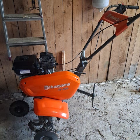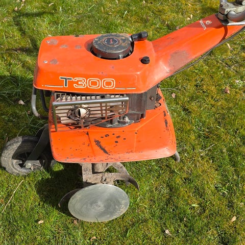 Jordfräs MINI TEX 202 lätt och smidig, inte använd på drygt ett år. Sopborstar och kantskäraren medföljer och är aldrig använda.