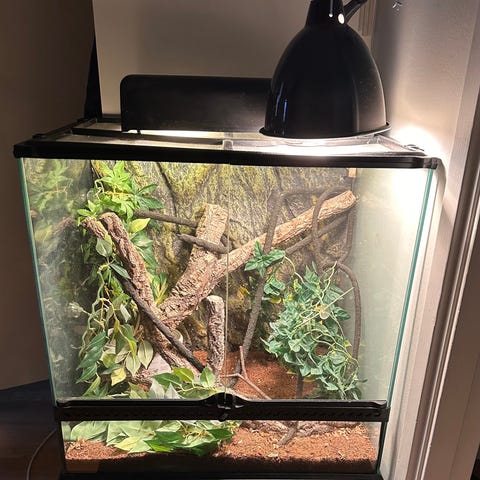 Ett stort terrarium med aliminiumram lite chippad i ena hörnet på ena glasdörren men annars vattentät och helt fungerande den har ej varit i bruk de senaste året