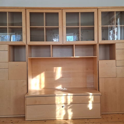 Passa på att fynda denna förvaringsmöbel i ek och ekfanér, total bredd 200cm där vardera modul är 100cm bred, 133cm hög och 40 cm djup. Det går att konfigurera "topp-modulerna" såsom man vill ha dem.