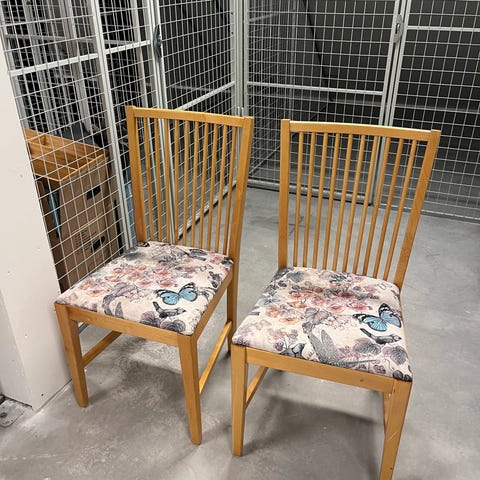Slitage på klädseln av sitsen, smutsiga och ett ben är brutet. Orginalbenet finns kvar och skulle möjligtvis kunna repareras.