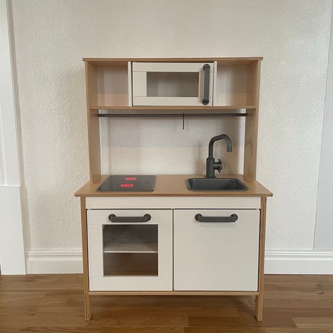 BRIO leksakskök i svart/vitt med separat spis/ugn och diskbänk. Till köket följer olika köksredskap och kastruller, skålar och formar. Det ingår även leksaksmat i trä och textil. Allt för 200 kr
