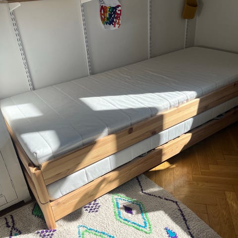 IKEA juniorsäng med sängram i trä med madrass och madrasskydd