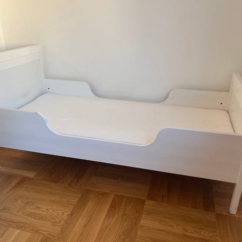IKEA juniorsäng med sängram i trä. Sängen har ribbotten och en enkel skyddssida på ena långsidan. Träramen är i ljus träfärg och sängen är avsedd för ett madrassmått i juniorstorlek. Passar som övergångssäng mellan spjälsäng och fullstor säng för barn.