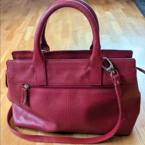 Björn Borg handväska för kvinna i fuskläder. Väskan är röd med korta handtag och avtagbar axelrem i kontrasterande färg. Huvudfacket stängs med dragkedja och insidan har ljus fodring med innerfack, varav minst ett med dragkedja för mindre saker. Passar för vardagsbruk och som mindre weekend- eller jobbväska där det finns plats för plånbok, mobil, nycklar och andra personliga tillhörigheter.
