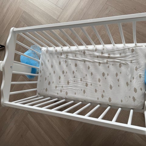 Vagga med stativ i vit färg. Vaggans korg är klädd med vit textil och inkluderar vadderad insats och sänghimmel i matchande tyg. Passar för spädbarn och kan placeras inomhus i exempelvis sovrum eller vardagsrum. Vaggans stativ har medar som möjliggör gungande rörelse.