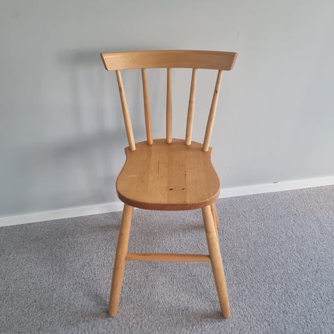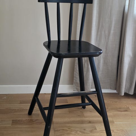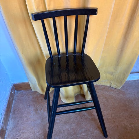Pinnstol barn, kullastolen, massiv björk, lackad. Står mkt stabilt. Sitthöjd 52cm, total höjd 79cm. Fint skick. Pris: 450kr
