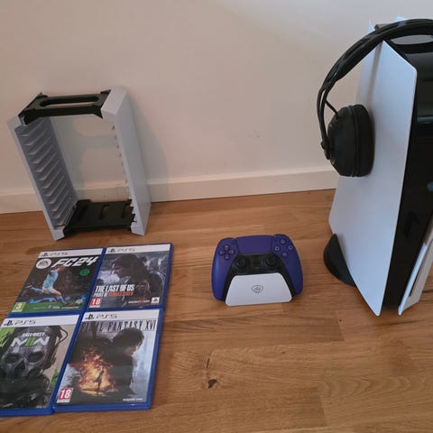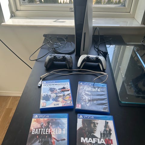 Säljer mitt PS5 slim, utan skivläsare. Allt är i väldigt fint skick, några spel följer med, se bild.