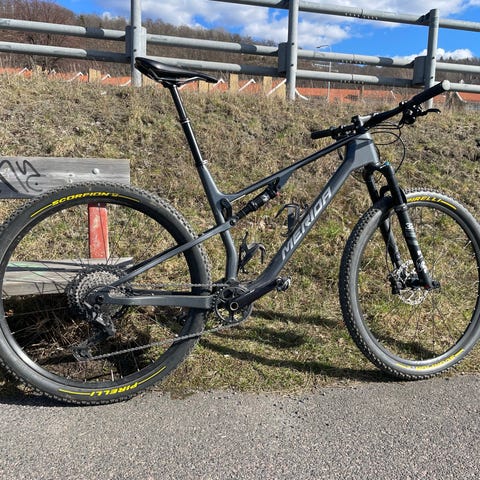 En lätt heldämpad cykel, med en ram i kolfiber. Perfekt för trial eller mountainbike.