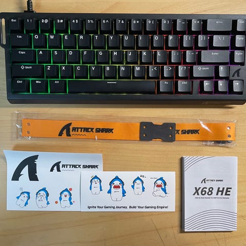 Antrek Shark X68 HE tangentbord. Kompakt mekaniskt tangentbord med magnetiska brytare och RGB-belysning. ANSI-layout i 60–65 %-storlek med avtagbar kabelanslutning. Levereras med handledsrem, klistermärken och manual enligt bilder. Lämpligt för stationär dator eller bärbar dator där ett mindre tangentbord önskas, till exempel för spel eller skrivarbete.