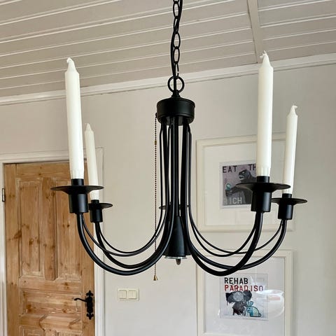 Svart takkrona i järnsmide med 4 ljushållare. Ställbar kedja/längd.