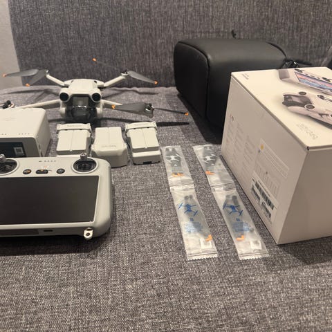 Fly more combo så totalt 3 batterier, DJI RC, 4a ND-filter, 4a extra propellrar och en väska.