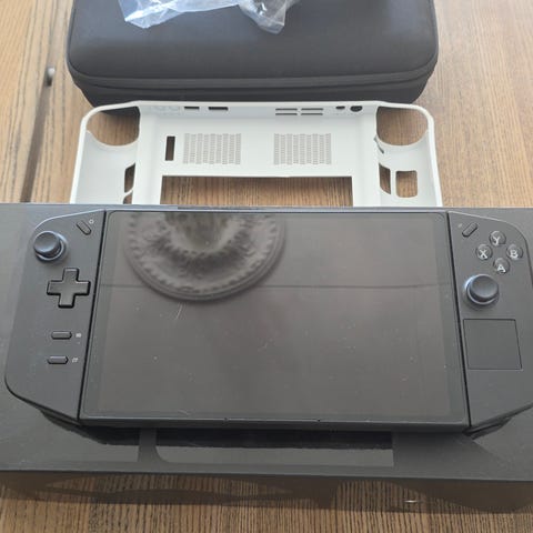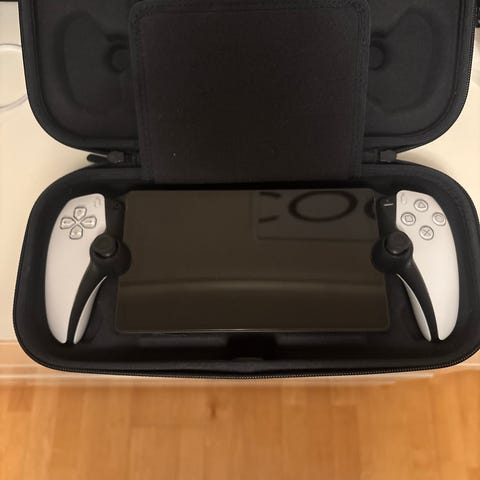 Sony Playstation portal handhållen konsol med fodral. Konsolen har inbyggd skärm och kontroller med styrspakar och knappar på sidorna. Fodralet är hårt och format invändigt för att rymma konsolen och tillbehör, med skyddande vaddering. Produkten är avsedd för spelande med Playstation 5-relaterat innehåll i ett portabelt format.