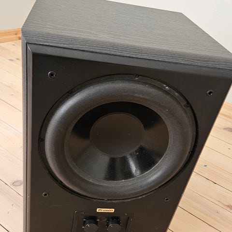 Högtalarpaketet består av flera högtalare i svart färg, inklusive golvhögtalare, mindre surroundhögtalare och en subwoofer. Subwoofern har anslutningspanel på baksidan med högtalarterminaler, RCA-ingångar och reglage för nivå och frekvens. Högtalarna är avsedda för hemmabioanvändning tillsammans med förstärkaren.