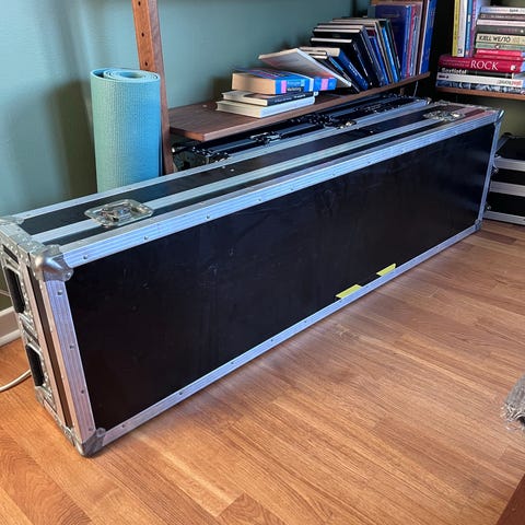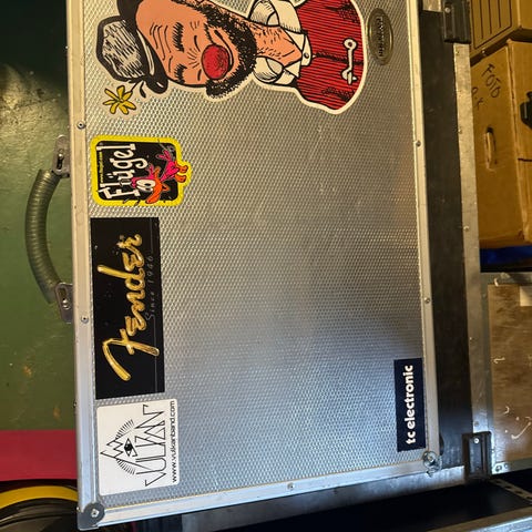 Trälåda/flightcase med förstärkningar och kanter i metall. Utrustad med låsbeslag och bärhandtag på sidan. Passar för förvaring eller transport av utrustning och tillbehör där ett stabilt yttre skydd önskas. Har själv använt den till förstärkare på turné.
