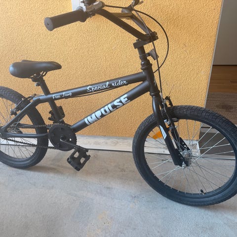 Extreme BMX-cykel med 20-tums hjul i svart färg. Utrustad med BMX-styre, fotpedaler och reflexer på hjulen. Passar för cykling i stadsmiljö, enklare trick och lek. Finns i Hagalund.