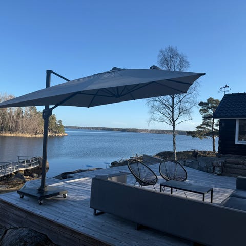 Säljer hängande parasoll beige köpt 2023 från Bauhaus. Mått 300 x 250 cm. Parasoll för fyllnadsstång ingår ej men kan köpas från Bauhaus eller Jysk.