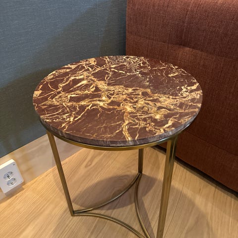 Runt sidobord från Mio med marmorskiva, dock är det en ska på marmorskivan se bild.