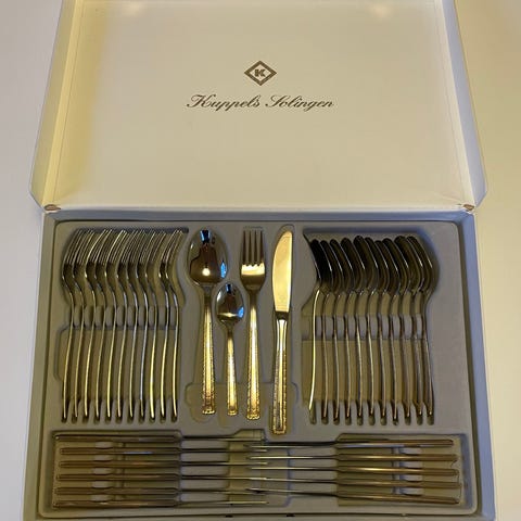 Hackman Myrna bestickset med en tårtspade och sex kaffeskedar i metall med gulddekor.