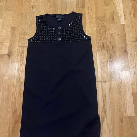 Modellen är ärmlös med rak passform och har dekorativa knappar/nitar framtill.
