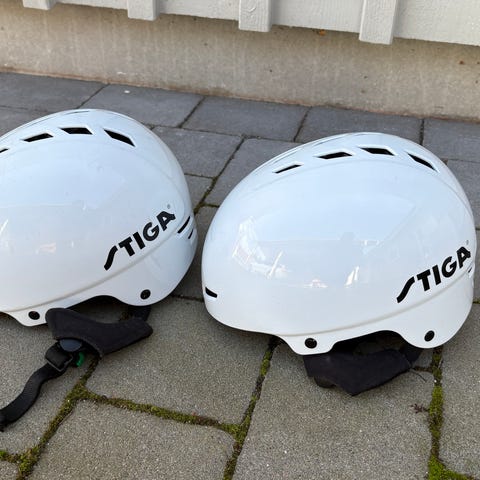 TSG hjälmar i svart och vit färg. En hjälm i matt svart utförande och en hjälm i vit med ventilationsöppningar upptill. Justerbart hakspänne med röd låsning. Passar exempelvis för cykel, skate eller annan liknande aktivitet där hjälm rekommenderas. Storlek och exakt modell framgår inte.
