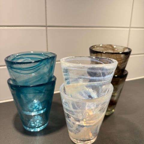 Kosta Boda 'Colonne' ljusstake i konstglas, designad av Anna Ehrner, med vita och färgade virvlar. H13,5 cm.