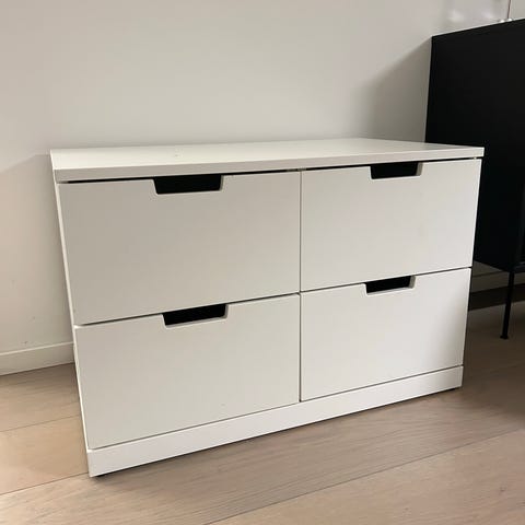 IKEA byrå med 3 lådor i vit front och svart stomme och toppskiva. Byrån har integrerade handtag på lådfronterna. Passar till förvaring i sovrum, hall eller vardagsrum. Mindre märken och repor kan förekomma på toppskivan enligt bild.