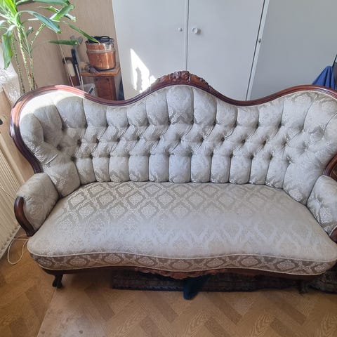 Soffgrupp i nyrokoko. Soffa, bord och två fåtöljer i mycket fins skick.