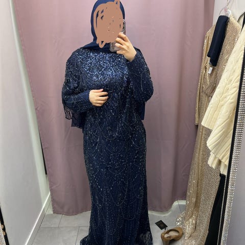 Blå lång klänning för dam i storlek L. Klänningen är axelbandslös med utsmyckade detaljer framtill och ned längs kjolen. Passar till exempelvis fest, bal eller andra högtidliga tillfällen. Priset kan diskuteras vid snabb affär.