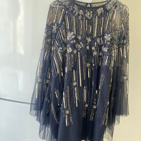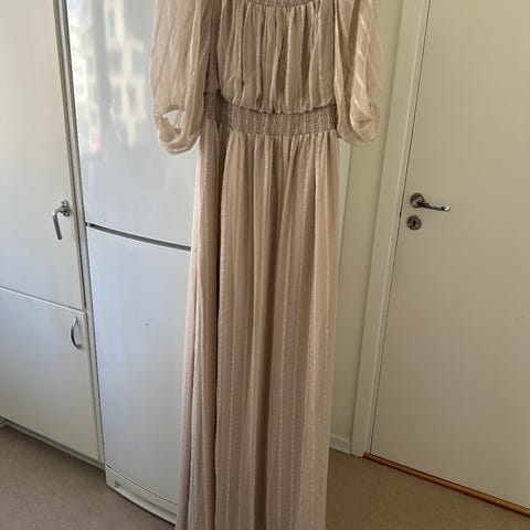 Svart långklänning för dam i storlek M. Klänningen har smala axelband, draperad överdel och markerad midja med dekorativ brooch i sidan. Lång, rak kjol med lätt fall. Passar exempelvis till fest eller högtidliga tillfällen. Priset kan diskuteras vid snabb affär.