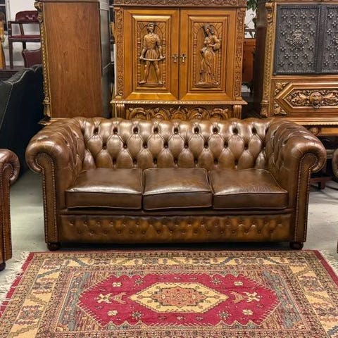 Tillfälle att köpa en exklusiv Chesterfield soffgrupp i elegant, konjaksfärgat läder.