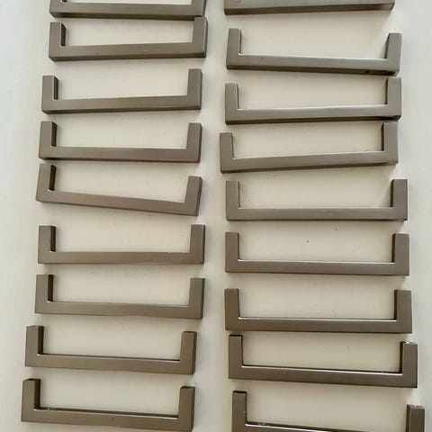 Handtagen har suttit i ett kök i ca 8 år så de är inte i nyskick, små repor och märken finns. Se bilder hur metallen ser ut med repor.