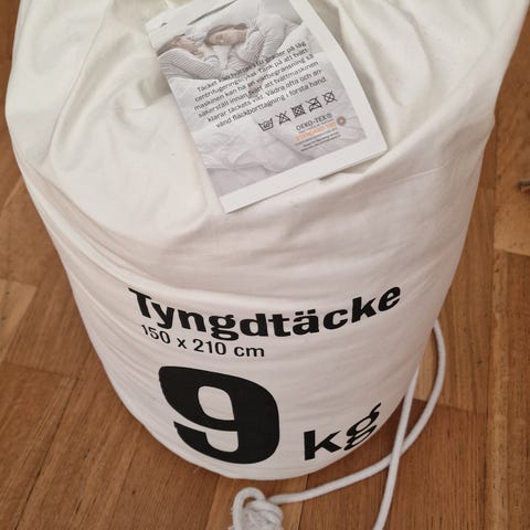 Mio tyngdtäcke med mått 150x210 cm och vikt 9 kg. Täcket är vitt och levereras rullat i förpackning. Avsett som ett tyngdtäcke för en person, kan användas i vanlig säng med standardmått 150x210 cm.