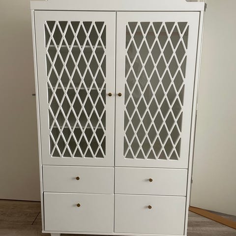 Garderob med två dörrar i färgen kalk med rottingdetaljer. Skåpet har en klädstång upptill för upphängning av kläder och en öppen bottenyta för förvaring. Passar som förvaringsmöbel i sovrum, hall eller annan del av hemmet där hängande klädförvaring behövs.