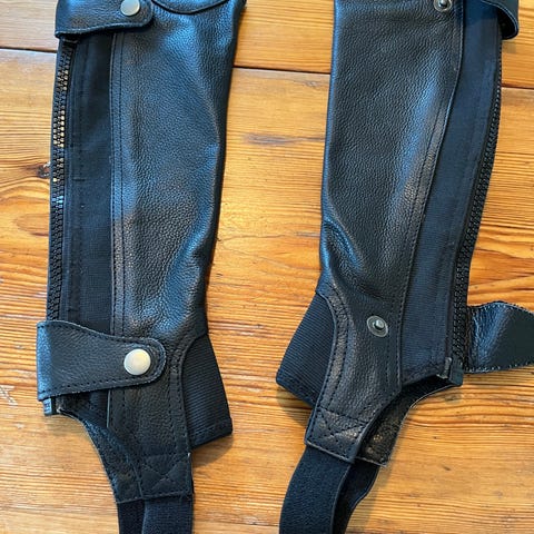 Hansbo Sport chaps i svart färg i storlek M. Modellen har dragkedja längs sidan samt knäppning nedtill.