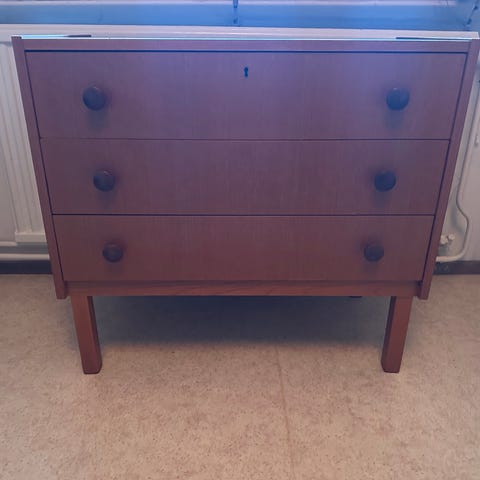 Liten lättplacerad byrå i teakfanér. Tre lådor och nyckel.