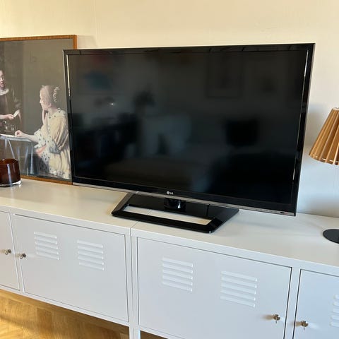 Tv i bra skick med fjärrkontroll, strömförsörjning och oöppnade fästen för väggmontage.