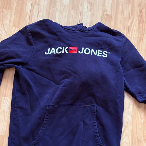 Jack & Jones huvtröja för herr i storlek L. Tröjan är blå och tillverkad i bomull. Modellen har huva med dragsko, lång ärm och magficka framtill. Stor logotyptext på bröstet. Passar som vardagströja eller till fritidsbruk.