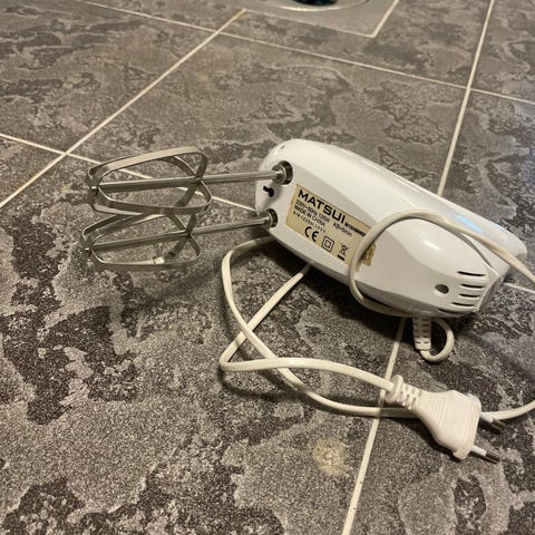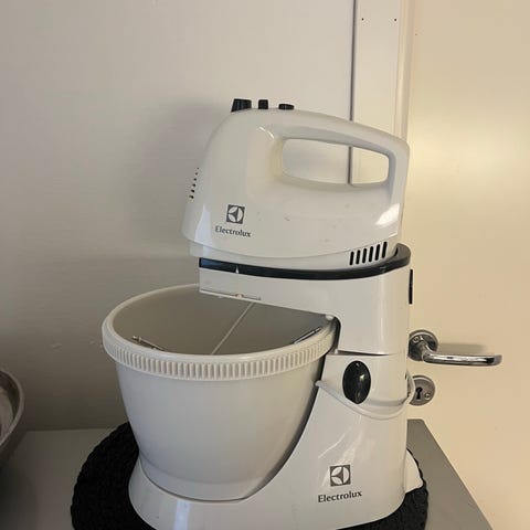Electrolux elvisp med skål i vit plast. Elvispen står i ett stativ med roterande skål och levereras med både vispar och degkrokar enligt bilderna. Passar för vispning av exempelvis grädde och smet samt för enklare degar i hushållet.