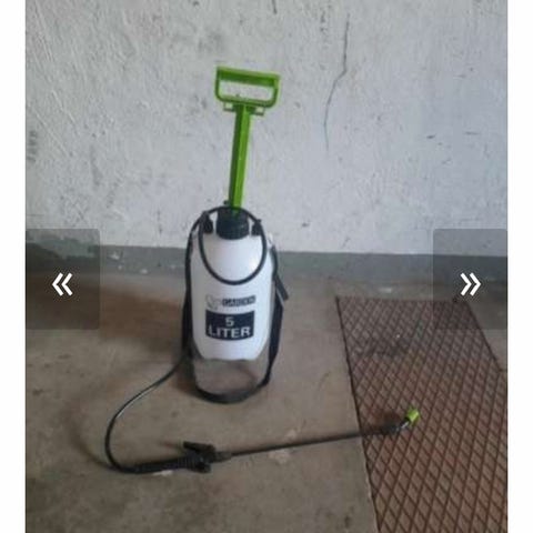 Tryckspruta i plast med bärhandtag, slang och sprutlans. Behållaren är vit med tryck och har manuell pumpfunktion upptill. Utrustad med munstycke för finfördelad spridning av vätska. Lämplig för exempelvis trädgårdsarbete, rengöring eller annan applicering av vätskor där jämn spridning önskas.